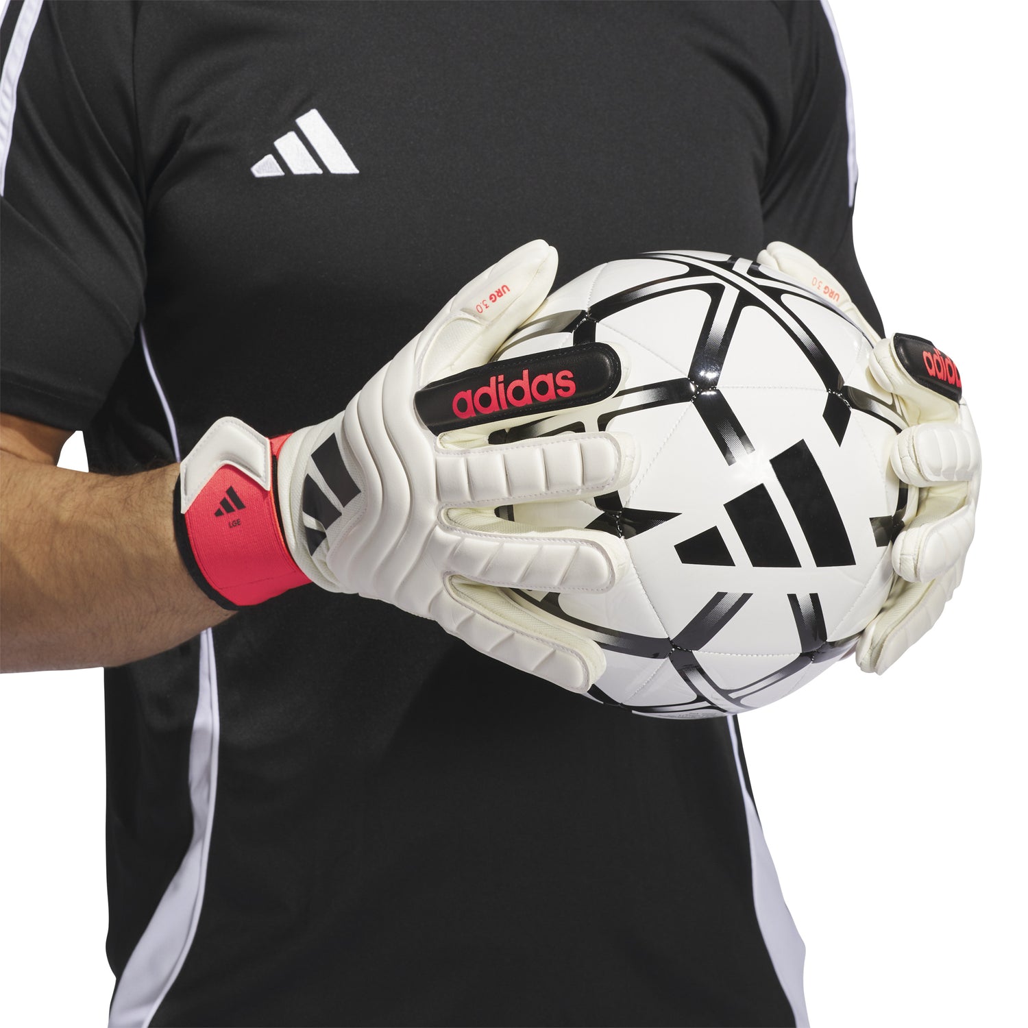 Keep goal in total comfort. These adidas Copa League goalkeeper gloves come with a classic latex backhand for a traditional feel and an elastic wrist strap for a perfect fit. Grippy and cushioned, URG 3.0 latex in the palm helps with every whipped cross and powerful shot. The fingers have a snug, negative cut for a natural feel.