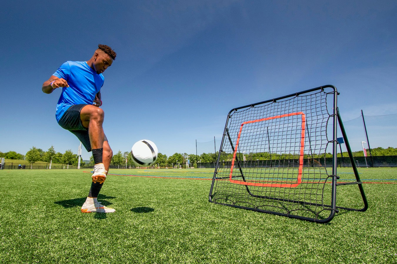 From the backyard to the practice field, our newest 16A4201 CFR-1 Rebounder is ideal for enhancing first touch and reaction time. This rebounder features a black, steel frame with a polyethylene net that attaches with bungees. The rebound surface features an adjustable angle and center target for more precise training. Weighing just under 12 lbs., transportation of this rebounder is effortless. For safety purposes, four (4) “J” style anchors are included.